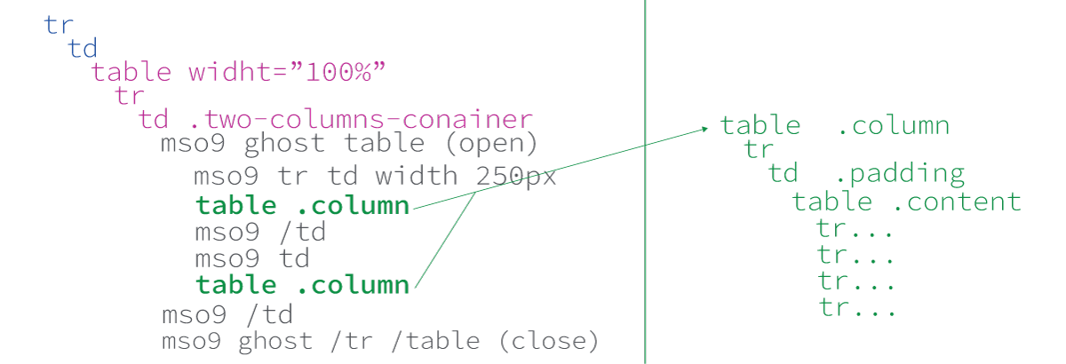 Microsoft Outlook does not support the max-width element. If it is used, an email will be blown out of proportion and take up 100% of the screen width. Therefore, we place our code inside ghost tables. Ghost tables have a specific width (600px). Thanks to special conditional instructions, we can display this part of the code only for Microsoft Outlook email clients.